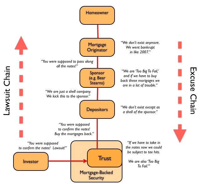 If the court follows the rules of evidence (and they do) if proper objections are filed. No eviction of a secuitized loan should ever prevail on an eviction; they cannot produce the foundation to authenticate the Trustees Deed it is based upon preliminary facts that they are unable and unwilling to bring to court. The […]